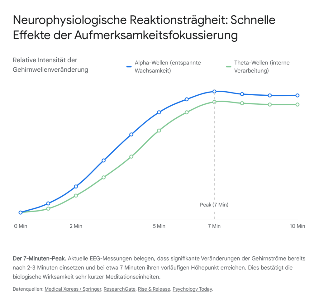 Die Ergebnisse sind für Befürworter der Kurzzeit-Meditation von immenser Bedeutung: Signifikante neurophysiologische Veränderungen in den Gehirnwellenmustern beginnen nachweislich bereits innerhalb der ersten 2 bis 3 Minuten der Praxis, selbst bei absoluten Anfängern.24 Noch aufschlussreicher ist die Beobachtung, dass sich bei etwa der 7-Minuten-Marke ein sehr deutlicher, messbarer Höhepunkt (Peak) der Gehirnwellen-Veränderungen manifestiert.8