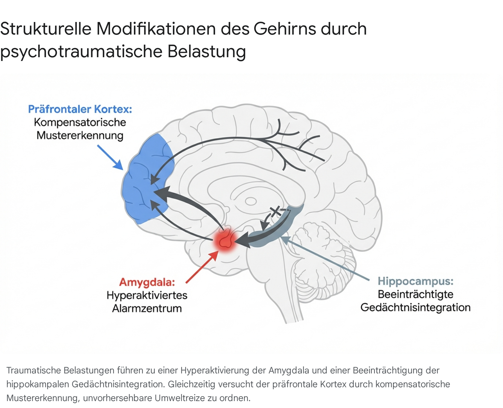 Zahlreiche neurobiologische Forschungsergebnisse, gestützt durch moderne bildgebende Verfahren (wie fMRT), belegen signifikante Veränderungen des Gehirnvolumens und der Gehirnfunktion nach extrem belastenden Ereignissen.6 Der Fokus dieser Strukturveränderungen liegt primär auf der Amygdala, dem Hippocampus und den präfrontalen Kortexarealen, die gemeinsam das komplexe Netzwerk der emotionalen Regulation und Gedächtnisbildung bilden.6